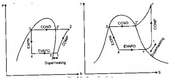 Represent subcooling and superheating on P-h and T-S diagram in refrigeration also give its effect on C.O.P. of refrigeration.