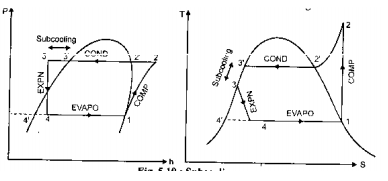 The process of cooling refrigerant below condensing temperature for a given pressure is known as sub-cooling. Due to sub-cooling the refrigerating effect increases or for same refrigerating effect the circulation rate refrigerant decreases and therefore COP of system increases. Thus sub-cooling is desirable & is done to increase refrigerating effect & COP of system.